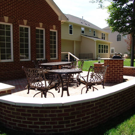 An elegant, raised rear patio was constructed with a perimeter defined by a low, curved brick wall, capped with a light-colored stone to create contrast.